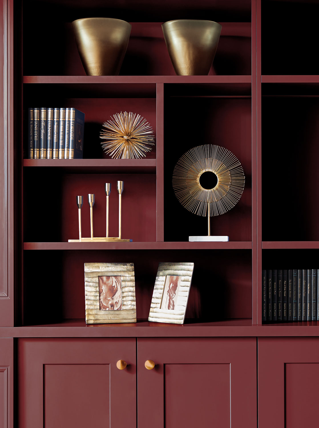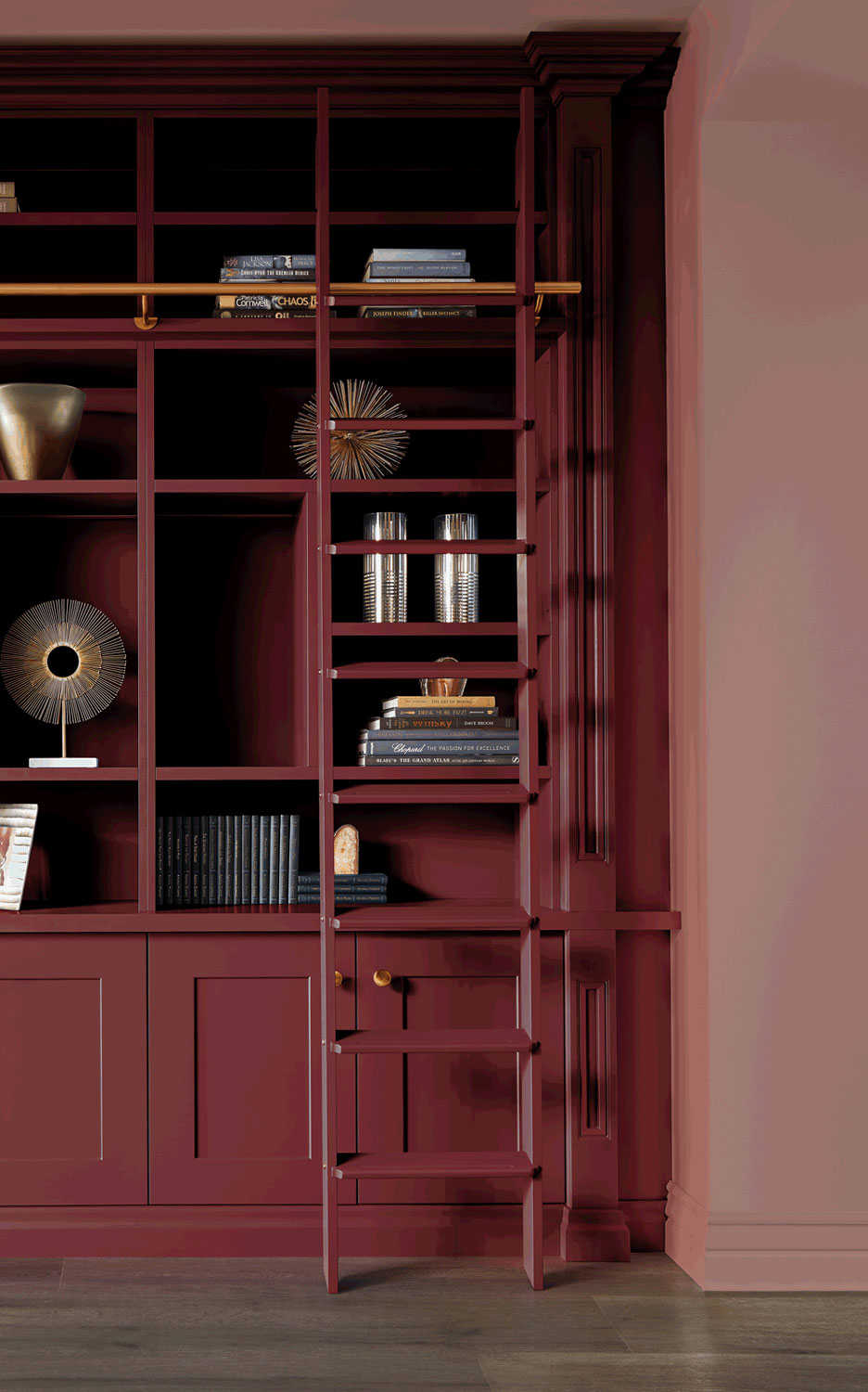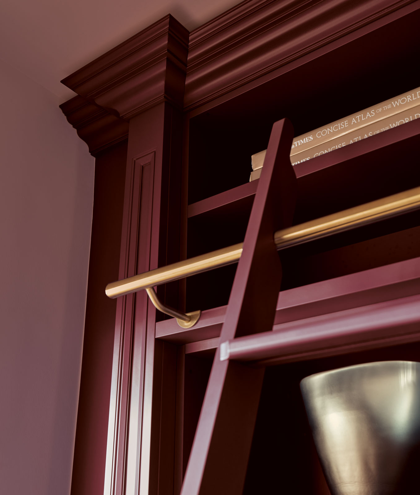 Both practical and decorative, this handcrafted ladder adds timeless charm while offering easy access to upper shelves. Finished in rich Carmine to match the cabinetry, it blends seamlessly into the design without overpowering the space.